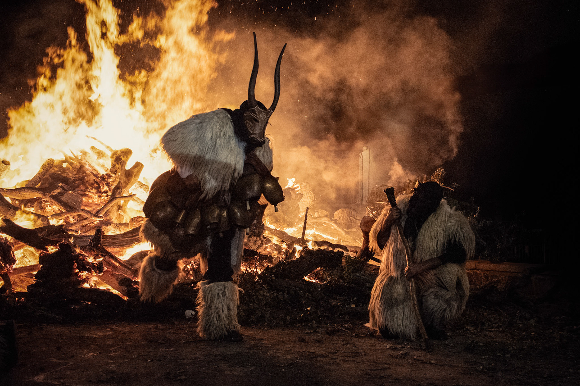 Durante il rito del fuoco, per tre notti di fila enormi falò rimangono accesi in tutta la barbagia, tre come il numero di giri che tutte le maschere devono fare intorno al fuoco, in senso antiorario, per far si che l’anno nuovo garantisca un buon raccolto, un buon pascolo.
